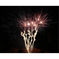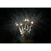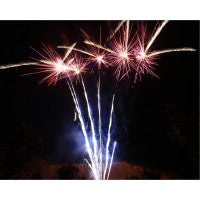 Rasanter Performance-Verbund mit 4 Batterien, 100 Schuss und 1,9 kg Nettoexplosivmasse! Phase 1: 25 Schuss Gabelbatterie mit silbernem Aufstieg und anschließendem blauen oder grünem Sternenbukett mit anschließendem rotem Glitzer; Phase 2: Silbern gesteppt aufsteigende Bombetten mit anschließender Zerlegung zu roten oder blauen Sternbuketts und silbernen Wirbeln; Phase 3: Mit leuchtendem Silberschweif gesteppt aufsteigende Bombetten mit anschließender Zerlegung zu roten und blauen Päonien-Buketts. Phase 4: 5x5 mit Silberschweif aufsteigende Fächer-Salven mit anschließender Zerlegung zu Titan-Blüten-Buketts umrahmt von silbernen Blinksternen.