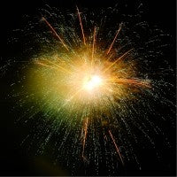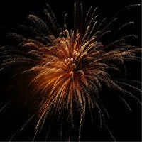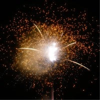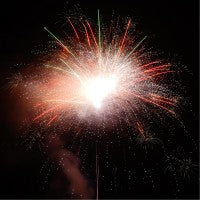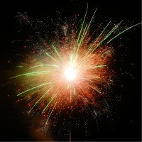 Phase 3: 36 Schuss Batterie, in schneller Abfolge geschossene, lautstark zerlegende bunte Verwandlungssterne zu Silber-Chrysanthemen;