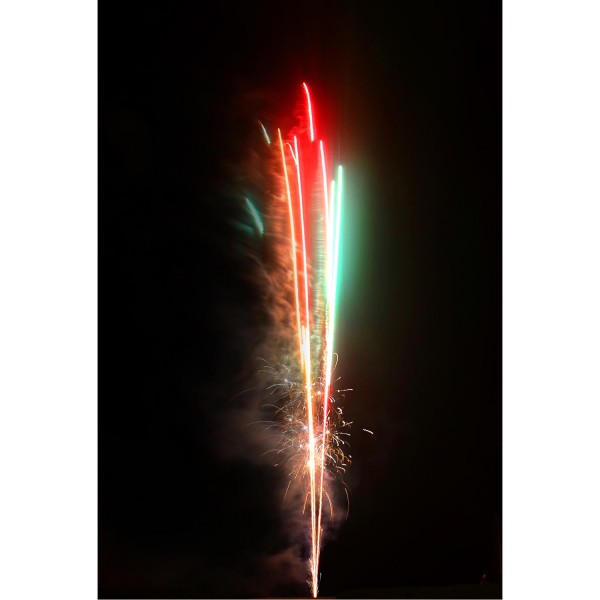 Phase 2: 61 Schuss, bunt gemischt aufsteigende Leuchtkometen, umrahmt von silbernen Knattersternen.