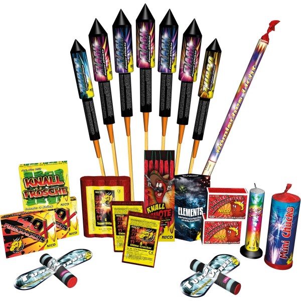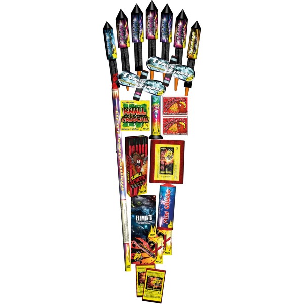 Großes Familiensortiment mit 7 Kopfraketen mit Blitz-Zerlegern (Flash-Powder) und 221 Effekten. Mit seinen Leucht- & Knalleffekten bietet es ein Erlebnis für die ganze Familie.