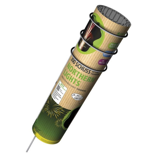 (1 Verpackung recyclebar als Altpapier; enthält keinen Kunststoff.(2 Plastikreduziert ggü. herkömmlichem Feuerwerk wurden Verpackung & Füße aus Plastik gegen recycelte Pappe getauscht. (3 Geräuschreduziert: ohne laute Zerlegerladung im Vergleich zu herkömmlichem Feuerwerk. (4 CO2-Neutral: durch Kompensation der CO2-Emissionen des gesamten Produktzyklus.